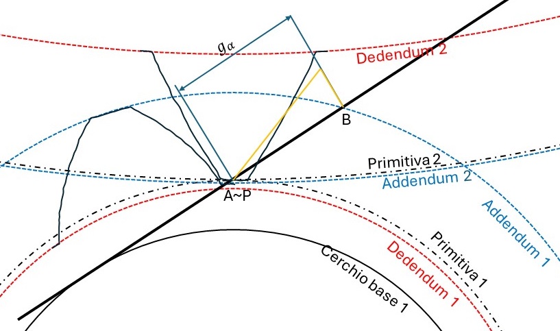An equally important feature of HSG gears that differentiate them from all traditional gears concerns the motion transmission. In fact, the conjugated surfaces have a unidirectional relative (or sliding) speed. This is achieved by avoiding the reversal of the motion at the primitive point (Figure 2(a)) by imposing the contact segment entirely in the recess arc. Depending on whether the contact segment starts from the primitive point or deviates from it to a greater or lesser extent, we have all-addendum or long-addendum type teeth Figure 2(b). The unidirectionality of the relative motion between the conjugated profiles entails certain benefits on the lubrication regime that can be established between them, which can become hydrodynamic, a regime that is certainly favored by the increase in the relative curvature as one moves away from the original point .