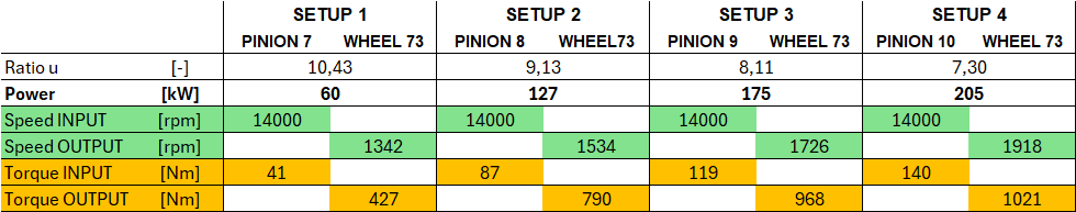 Nel corso delle attività di ricerca è stato dimostrato che, applicando la teoria HSG, è possibile ottenere, a parità di interasse (es. in figura i = 130 mm), di ruota dentata e di cassa, diversi rapporti di trasmissione (nel caso specifico pari a circa 10:1, 9:1, 8:1 e 7:1) semplicemente modificando il pignone, rispettivamente con 7, 8, 9 e 10 denti, mantenendo invariata la ruota condotta con 73 denti.